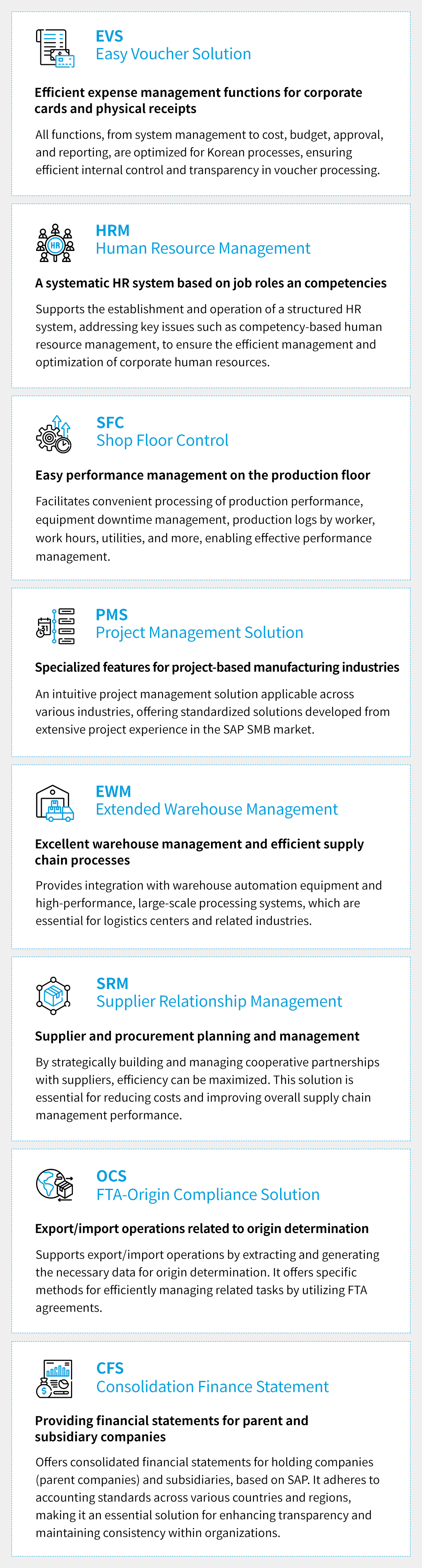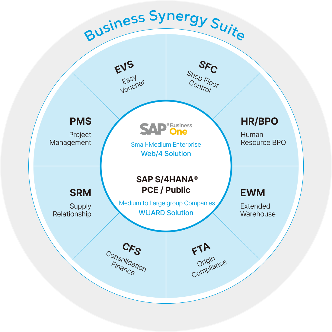 Business Synergy Suite is an integrated module package that extends the usability of ERP systems. It provides industry-specific add-ons such as Easy Voucher, HR, SFC, PMS, EWM, SRM, OCS, and CFS. With a focus on field innovation, it helps enterprises improve operational efficiency and strengthen competitiveness.