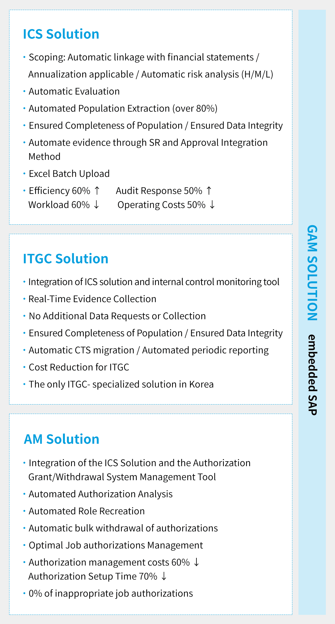 Woongjin’s Global Audit Management (GAM) Solution is a unified platform for audit, internal control, and authorization management. It supports both SAP and non-SAP systems, providing IAM, access control, and SoD (Segregation of Duties). With GAM Solution, enterprises can improve audit readiness, ensure compliance, and reduce operational risks.