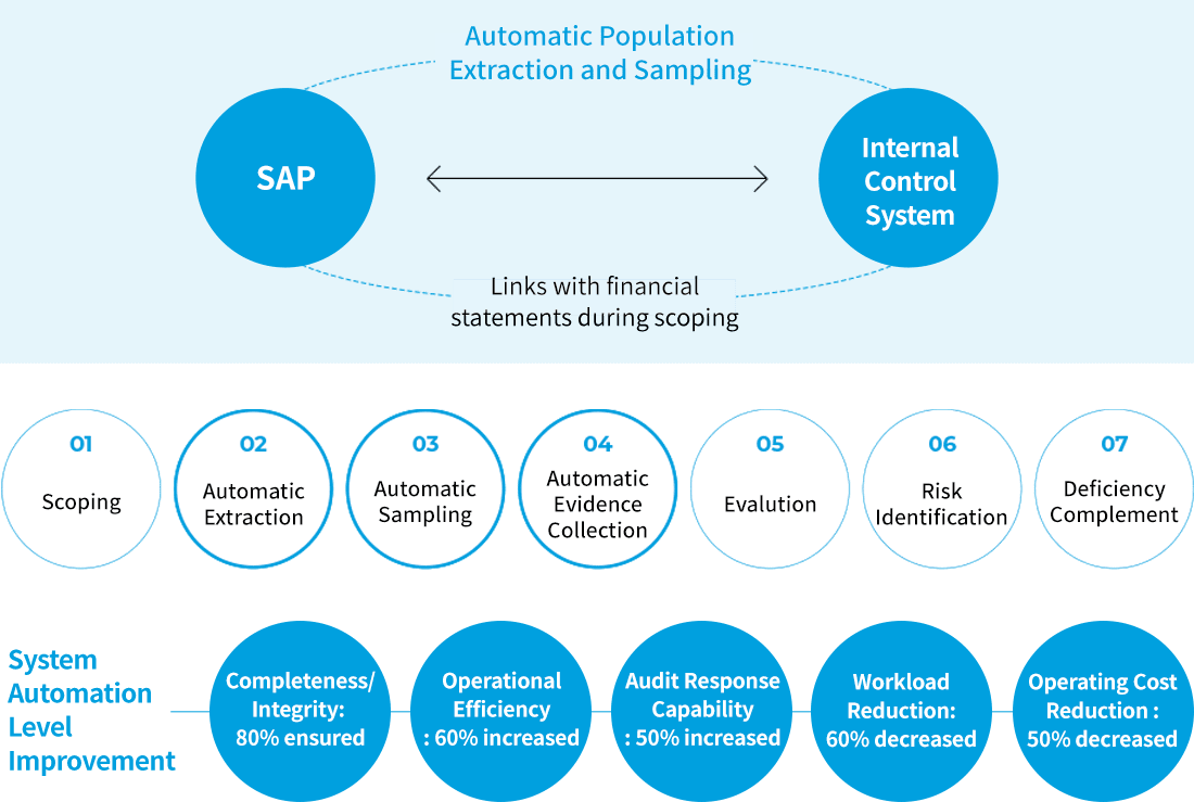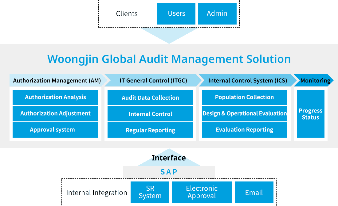 Woongjin’s Global Audit Management Solution is a proactive system designed to support effective operation of Internal Control over Financial Reporting (ICFR) and to enhance risk management. With this solution, customers can manage Internal Control, IT General Control (ITGC), and Authorization Management (AM) following standard processes while gaining business insights through real-time monitoring.