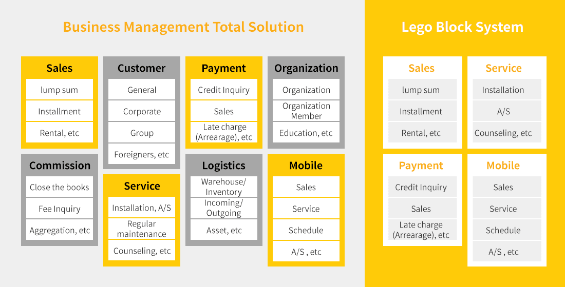 WRMS is a system that can be applied to any industry by selecting only the necessary modules, and it is specialized for rental/subscription models.